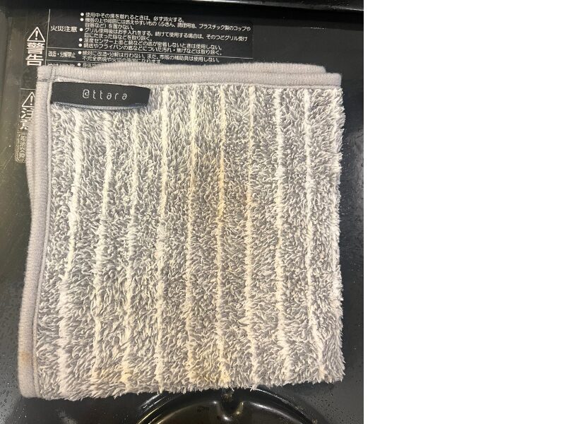 油汚れを拭いたあとは、マイクロファイバーにしっかり油が吸着して、見た目にも汚れがつきます。