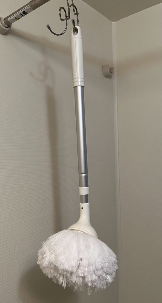 柄も伸びるので、浴槽の外から楽な姿勢で使えます。終わったら縮めてコンパクトに収納。