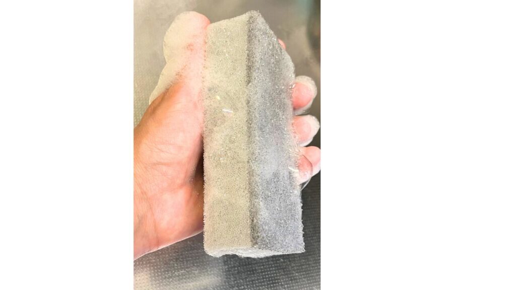 一般的な100均スポンジだと1週間ほどでヘタってしまうことが多いですが、三ッ星スポンジはまだ現役。